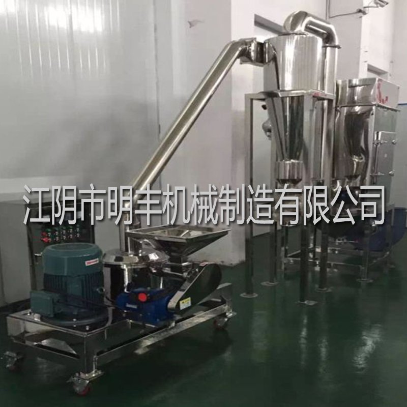 物料由料口进入粉碎室,被高速旋转的的方刀剪切粉碎,通过负压风运的方式把物料送入旋风分离器,袋式除尘器,排出物料粉尘由吸尘器经过布袋回收。