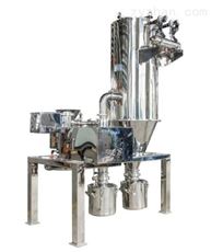 该机有粉碎主机、旋风分离器、脉冲除尘箱等部分组成。物料由加料斗进入粉碎室,通过高速旋转的硬质合金刀片进行粉碎,粉碎细度可调节分级刀与分级盘的距离来达到所需要的细度,粉碎好的物料经转离心力和引风机的作用进入旋风分离器,然后,通过关风机出料,粉尘进入脉冲除尘箱,经过过滤筒过滤后回收利用。该机按“GMP”标准设计,整机全部用304不锈钢材料制造,粉碎过程中无粉尘飞扬。
