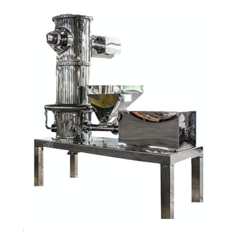 首先采用刀式粗碎机对中药原料初加工,然后进行二次冲击 细碎,*终送入GMP气流粉碎机进行超细粉碎。物料在气流粉碎室内的数个喷嘴产生的高速气流冲击下,相互碰撞、相互摩擦、瞬间破裂,实现超细粉碎,通过内 置分级机的分选,合格产品随气流排出,进入旋风分离器、捕集器收集,粗颗粒返回粉碎室继续粉碎,气体由引风机排出。