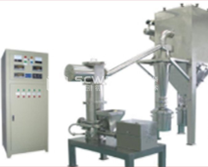 压缩空气经过冷冻、过滤、干燥后,经喷嘴形成超音速气流射入粉碎室,使物料呈流态化,被加速的物料在数个喷嘴的喷射气流交汇点汇合,产生剧烈的碰撞、磨擦、剪切而达到颗粒的超细粉碎。粉碎后的物料被上升的气流输送至叶轮分级区内,在分级轮离心力和风机抽力的作用下,实现粗细粉的分离,粗粉根据自身的重力返回粉碎室继续粉碎,合格的细粉随气流进入旋风收集器,微细粉尘由袋式除尘器收集,净化的气体由引风机排出。