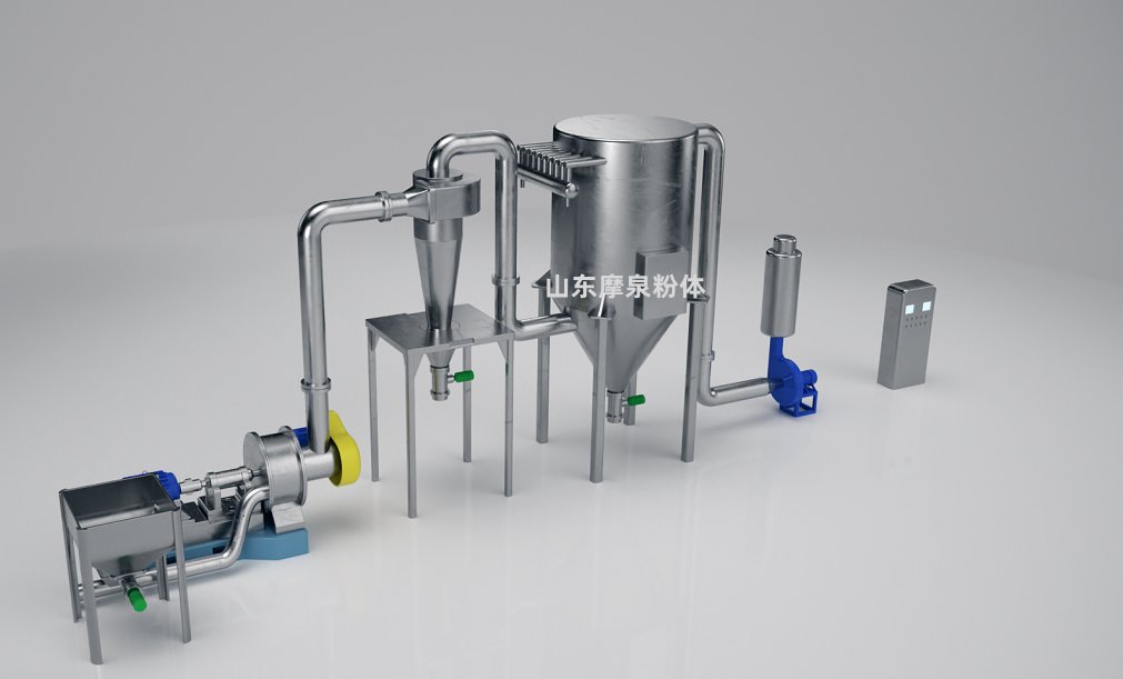 机体内腔为园筒形,上部份为超微分级机,下部分为超微粉碎机。粉碎室由粉碎盘和磨块组成,用来将物料击碎成细粉,分级室由分级叶轮组成,能把细粉分成粒度达标品和未达标品两种规格,达标品经出料管排出,由旋风集料器收集。未达标品沿腔体内壁回落到粉碎室,继续粉碎直到达标为止。