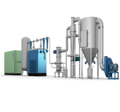 流化床气流磨作为超细粉碎的一种重要设备,广泛应用于非金属矿及化工材料的超细粉碎,具有粒度分布窄,颗粒表面光滑,颗粒形状规则,纯度高,活性大,分散性好等特点。应用:非金属矿,电池材料,精细化工,医药食品,颜料油漆,粉末冶金等超细粉体行业。流化床气流磨是一种气流粉碎和分级一体的设备,流化床气流磨粉碎系统组成主要有气源、原料供给系统、流化床气流磨主机,微粉收集系统(含引风),电气控制柜等。