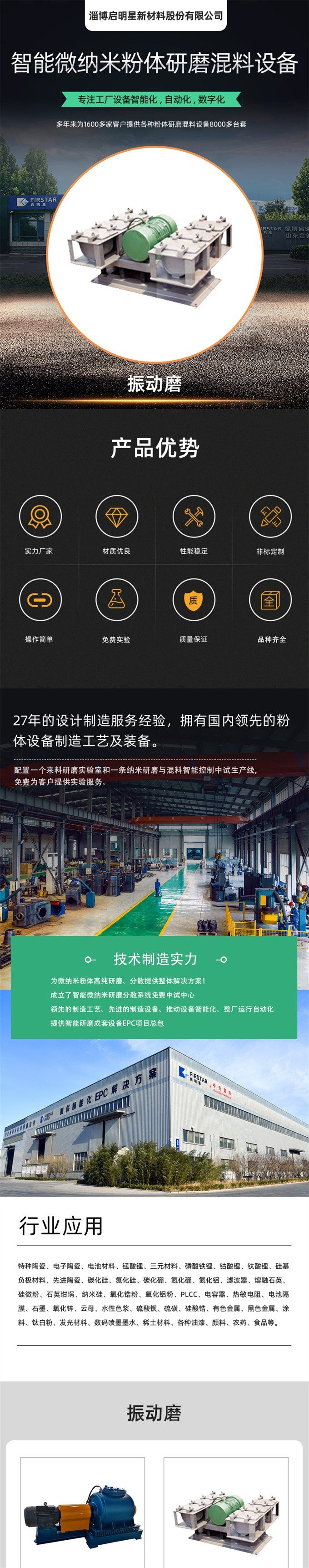 淄博启明星新材料股份有限公司自主研发生产的振动球磨机主要由机架、激振器、磨罐、电控系统、冷却系统、充气系统和研磨介质等组成。激振器产生的高频圆振动,使磨内的研磨介质产生了由高速自转和低速公转组合的高强度旋转冲击运动。这种复合运动对物料形成强力冲击破碎和研磨作用,一般可将物料研磨到微米甚至亚微米级、粒度分布范围窄。