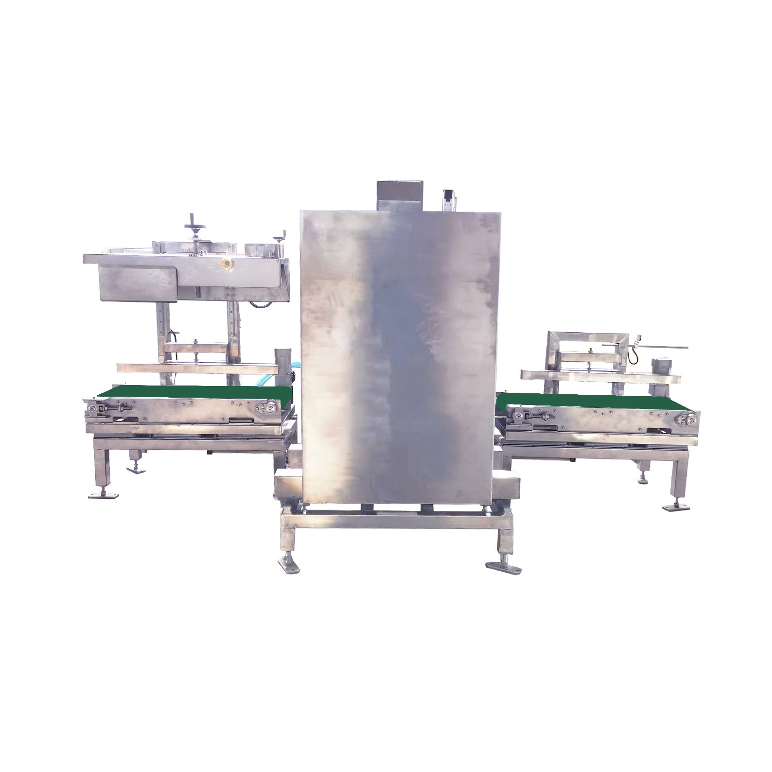 灌装完成后人工将待真空包装的产品袋导入前段进料流水线---袋口导入皮带和前载重流水线中部载重流水线同步启动---当产品袋前行脱离载重流水线*后一个光电开关---前段载重流水线退出真空室---载重流水线退到位---关上真空室盖子---机器自动抽真空---真空自分为慢速抽---中速抽---快速抽---自动封口---自动放气---放气结束后---自动打开真空室盖子---后载重线进入真空室---中部,后部载重线同时启动---产品自动走出后部载重线自动停下