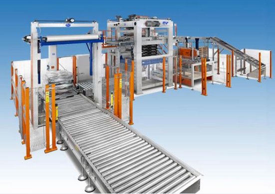 高位码垛机将料袋输送至一定高度后,按照预定方式对料袋进行转位、编组、推袋、分层、码放,将料袋按层码放到托盘上,*后将码好的满垛输出。