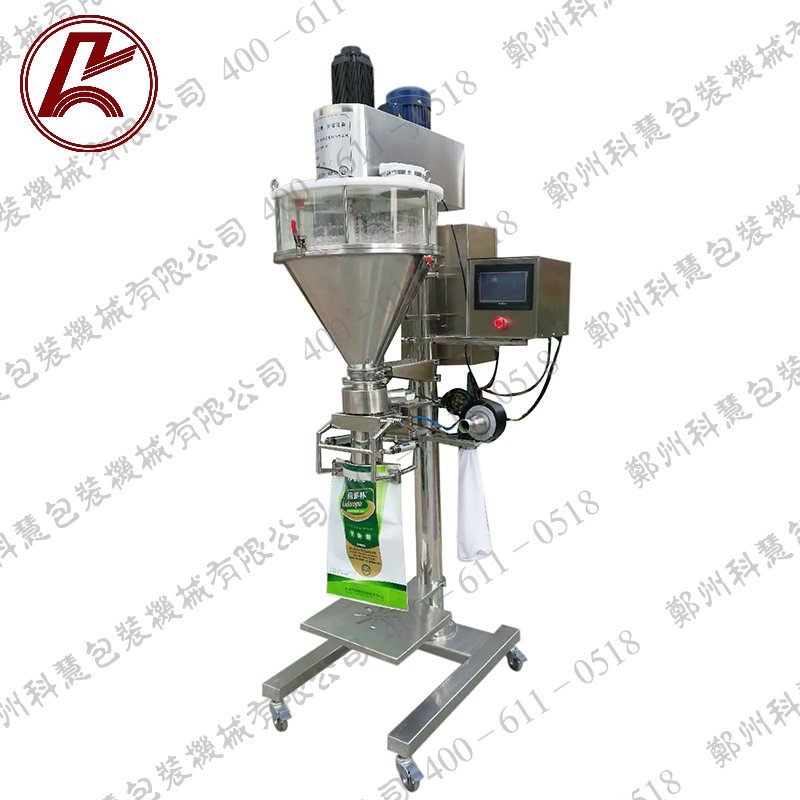 螺旋上料机将物料提升至包装机料仓内,人工往夹袋器上套上包装袋,关电开关给控制仪表一个夹袋信号,夹袋器把袋子自动夹住,控制仪表控制螺旋给料机构将物料开始从料仓内往包装袋里自动充填灌装,充填过程中给料机构分快、中、慢三级放料,保证速度及精度,到达预设包装值后,夹袋器自动松开,将包装袋送到热封机处封口,完成包装。