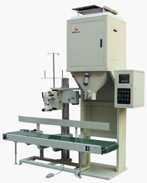 电子定量包装机工作时,在配料控制器的控制下,自动清零后开启加料机构进行加料,物料不断的进入计量斗内,传感器将其重量转换成相应的电信号,送至配料控制器,配料控制器在其面板窗口显示出物料的重量值,并根据设置的参数依次输出各部件控制信号,使加料机构以快,慢两种流速连续向计量斗加料,完成定量加料。夹上包装袋,计量斗料门打开,物料依靠自重,下料经出料筒灌包。灌包结束,放料门关闭,夹带机构张开,自动卸包,一个工作周期结束,控制器自动进入下一个工作周期。夹袋筒旁边的夹带开关可控制夹袋机构的夹紧动作,用于人工套袋操作,且只有夹袋机构处于夹紧状态时,控制器才会发出灌包控制信号。
