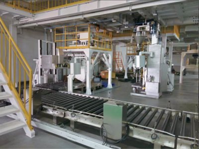 产品概述:三元材料吨包装系统由(称重料仓、星形给料机)甲供设备、振动给料机、小秤计量系统、大秤计量系 统、挂夹袋机构、吹袋收尘机构、钢平台、秤下升降平台、秤下辊子输送机、秤下振动机构、抽气热合机、空 托盘输送机、控制系统组成。