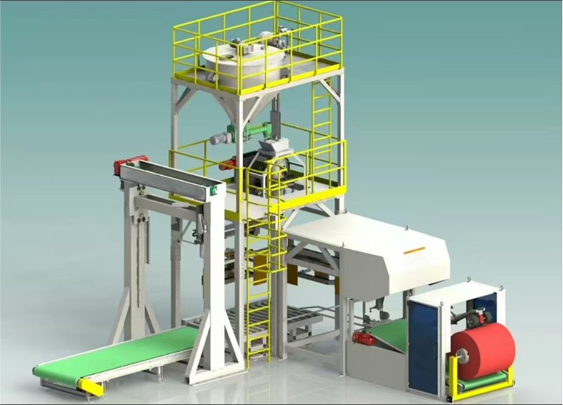 自动吨袋包装机系统克服了传统半自动吨袋包装机的人工上袋(挂袋)、人工添减原料复称等缺点,实现了自动上吨袋(无需人工挂袋)、自动送袋、自动校正、自动称重下料、自动牵引、 自动扎口、自动输送等功能;
