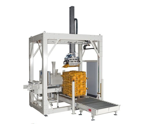 抓取装置在其垂直轴上旋转,根据编程的层形成打开并准确地将袋子放在托盘上。