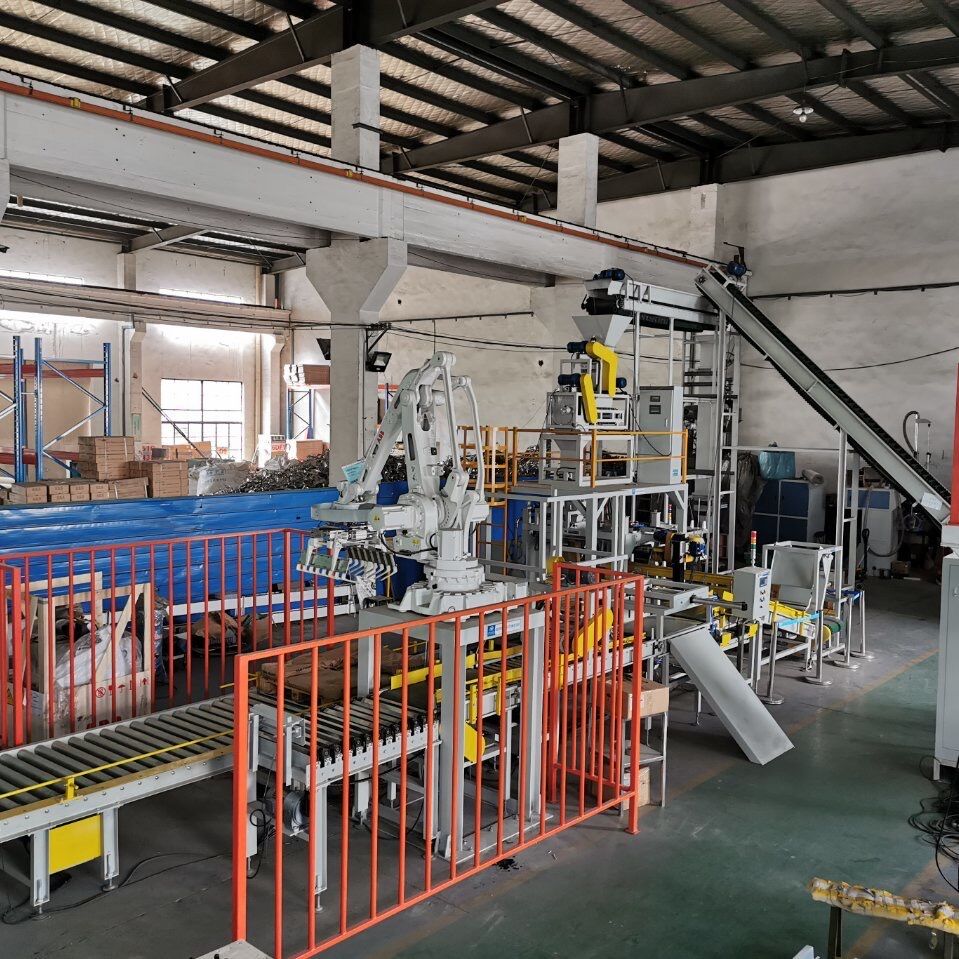 这是无锡航一机械有限公司生产的全自动包装码垛线、全自动包装线、全自动装袋线、全自动灌装包装线、自动装袋系统。进料灌装、自动称重装袋、自动进袋和袋顶封口、自动袋输送输送机、机器人前自动空托盘进料、带托盘分配器的自动机器人码垛在托盘上堆垛、装载托盘输送机、自动托盘包装等。全自动完成,连续工作。