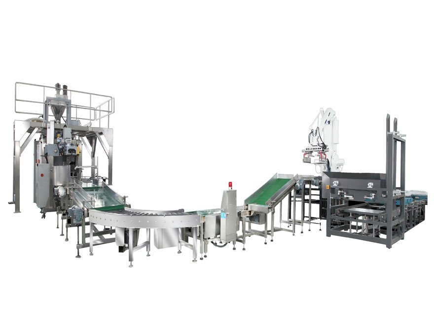 无人化包装生产线由自动称量包装机、全自动上袋机、自动缝纫封口机、重量检测机及全自动码垛机组成。整条生产线可实现对散状物料的自动称量、包装、码垛作业。包装速度可达600袋/小时(25公斤/包、PP、牛皮纸袋)。