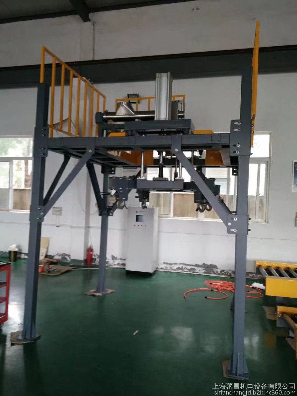 将吨包装袋套在加料嘴上,将包装袋四角挂在气缸上,按动“开始”按钮,这时压袋气缸开始工作并压住袋口,气缸将包装袋四角撑开,控制器将包装袋重量自动去除,螺旋转动迅速将物料灌入袋中,振动台开始振动将物料振实,随袋中空气一起溢出的粉尘通过吸尘器由除尘器吸走,待加料快到设定值时,螺旋转速减速慢加,振动停止,到设定值时,加料停止。误差<0.3%。这时压袋气缸松开袋口,气缸将包装袋四角松开,铲车将包装袋送出。