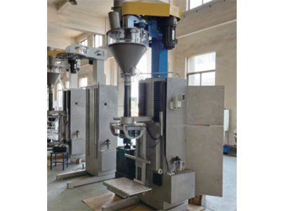 工人套袋口,按夹带按钮,称重架上升,秤体清零→垂直螺旋(可选配)启动粗加料→粗加料至额定称重的95%时,螺旋变频降速,同时夹袋机构根据物料的重量边加料边下降,加料至100%,称重结束,料门关闭→标袋下降至辊筒输送线上→称量完成