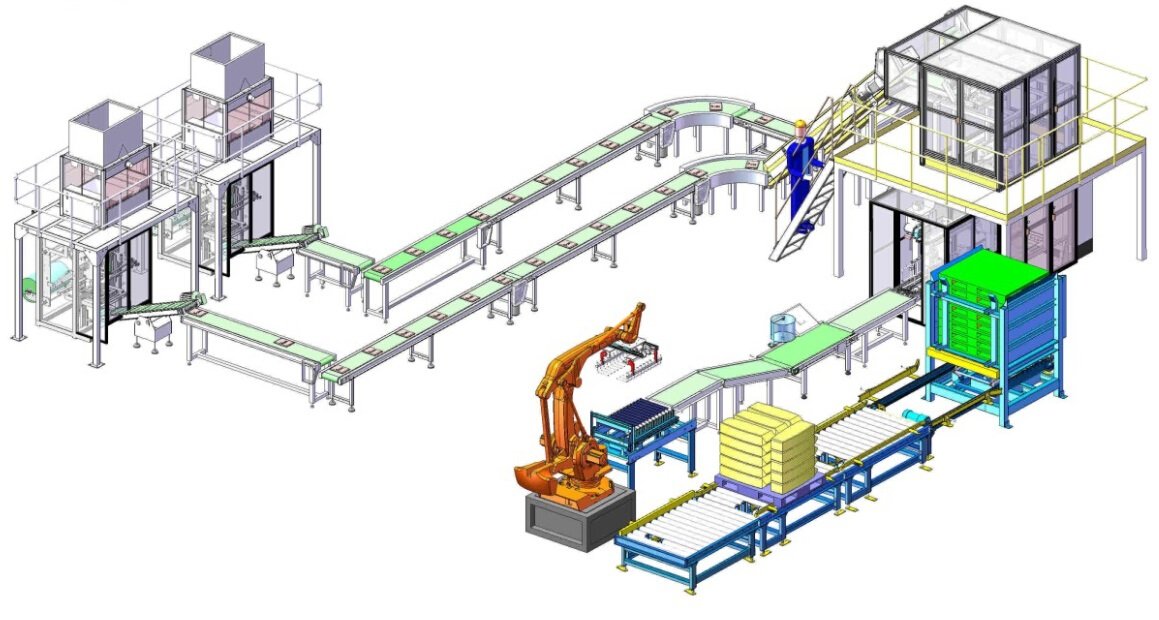 朗士达站全自动化包装码垛设备系统由自动称重、自动供袋、包装封口、输送检测、码垛等单元组成,以实现物料从成品出仓供料、上袋、称重、装袋、封口、输送整形、重量检测、金属检测、检选筛选、喷码打印、自动码垛全过程的自动化操作程序。运行时间长,可靠性强;操作周期时间短,速度快;零件生产质量稳定,包装精度高;适用恶劣生产环境,功能强;柔性化集成和市场,通用性能稳定,是机、电、仪、气、机器人一体化的高科技产品。广泛应用于建材、化工、化肥、粮食、港口、物流等行业。