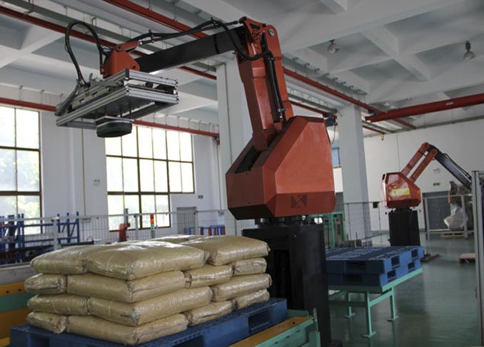 码垛机是将装入编织袋的物料或者是经过包装和未经包装的规则物品,按一定排列码放在托盘(木质)上,进行自动堆码,可堆码多层,然后推出,便于继续进行下一步包装或者叉车运至仓库储存。码垛机实现智能化操作管理,可大大地减少劳动人员和降低劳动强度。 全自动包装码垛设备广泛用于石化、食品、医药、饲料、粮食、有色矿物和建材等行业中的粉状、粒状物料、规则有一定体积物品的自动包装和自动码垛。
