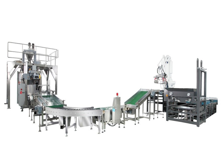 自动套袋→物料称量→填充物料→自动缝包机→输送→机器人码垛。