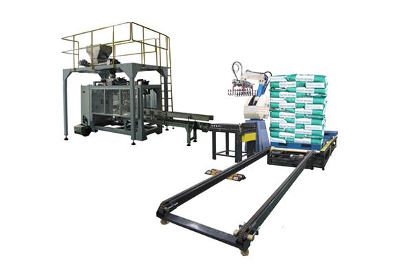 全自动包装码垛生产线由自动称量包装机、全自动上袋机、自动缝纫封口机、重量/金属检测机及全自动码垛机组成。整条生产线可实现对散状物料的自动称量、包装、高低位码垛作业。该生产线含公司多项**发明,包装速度可达720袋/小时(25公斤/包、PP、牛皮纸袋等),技术水平国*际领*先。