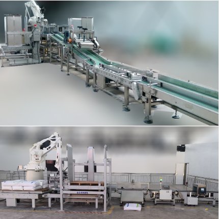 应用于粮食、食品、医药、化工、种子、饲料、建材、日化、新型材料等行业。系统主要功能是将粉状、颗粒状、液体等物料装进包装袋、纸盒,再将包装袋、纸盒自动装进箱体中,然后将箱体自动码垛缠绕。该系统可实现高度自动化和信息化,大大降低劳动成本和劳动强度,同时全面提升工作精度和效率。