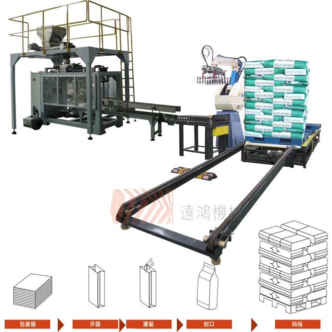 自动套袋→物料称量→填充物料→自动缝包机→输送→机器人码垛。
