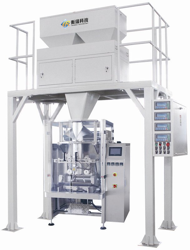 该机组由一台四秤定量包装秤和卷膜式包装机组成,集称量、制袋、折边、充填、封口、打印、冲孔计数于一体,采用伺服电机同步带拉膜,具有自动纠偏功能。PLC控制元器件均采用国际优质产品,性能可靠。横封纵封采用气动,动作平稳可靠。先进的设计保证了该机调整、操作十分方便。北方寒冷地带均采用加热装置耐低温处理。适合各种松散物料如玉米、水稻、棉花籽、油菜籽、五谷杂粮、鱼虾料、宠物饲料、塑料粒子、化工颗粒、食品、膨化食品、干果、砂糖、大米等物料的包装。
