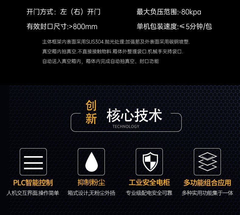 侧开门设计:独特的水平侧开门结构,方便物料快速、准确地装入包装袋,提高了生产效率。同时,侧开门还具备密封性能优良、操作简便等特点。