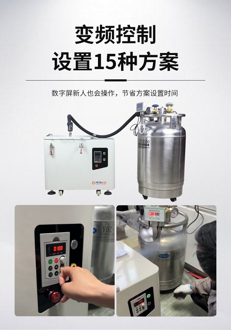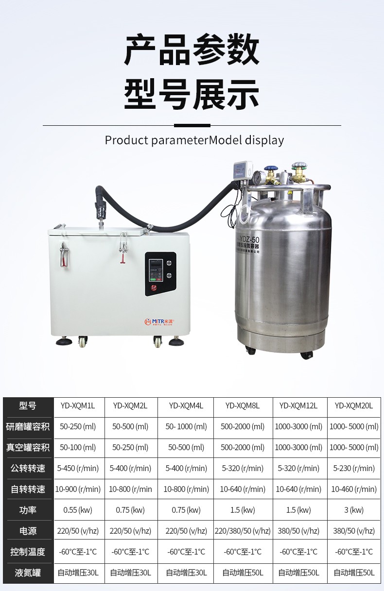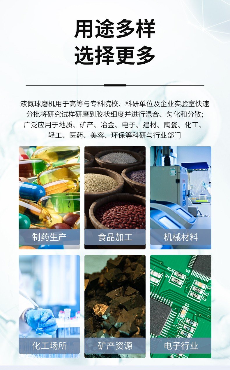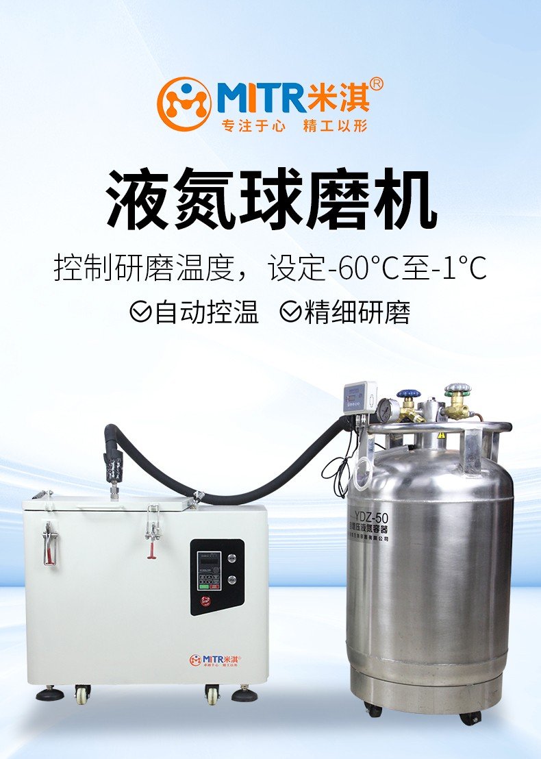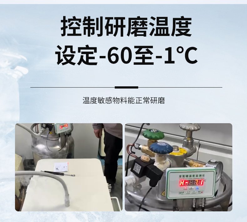 液氮行星球磨机是一款立式行星球磨机,多方位行星球磨机的升级产品,行星式球磨机是混合、细磨、小样制备、纳米材料分散、新产品研制和小批量生产高新技术材料的必备装置。该产品体积小、功能全、效率高、噪声低,是科研单位、高等院校、企业实验室获取微颗粒研究试样(每次实验可同时获得四个样品)的理想设备,配用真空球磨罐,可在真空状态下磨制试样,行星球磨机又称高能球磨机,在纳米研磨,机械合金过程都起着较高实验帮助,它的能量高于普通球磨机的十倍之余,但是高能的球磨过程中能量过高会导致罐体内外都有较高的温度,随之而来的是粉体的粘壁和冷焊,且生物样品直接导致温度过高改变样品原有性质,因此液氮冷却行星式球磨机可以避免此类问题。