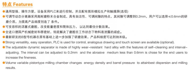 可变容积的活塞式磨腔,改变能量密度和筒体压力,以达到**分散效果。