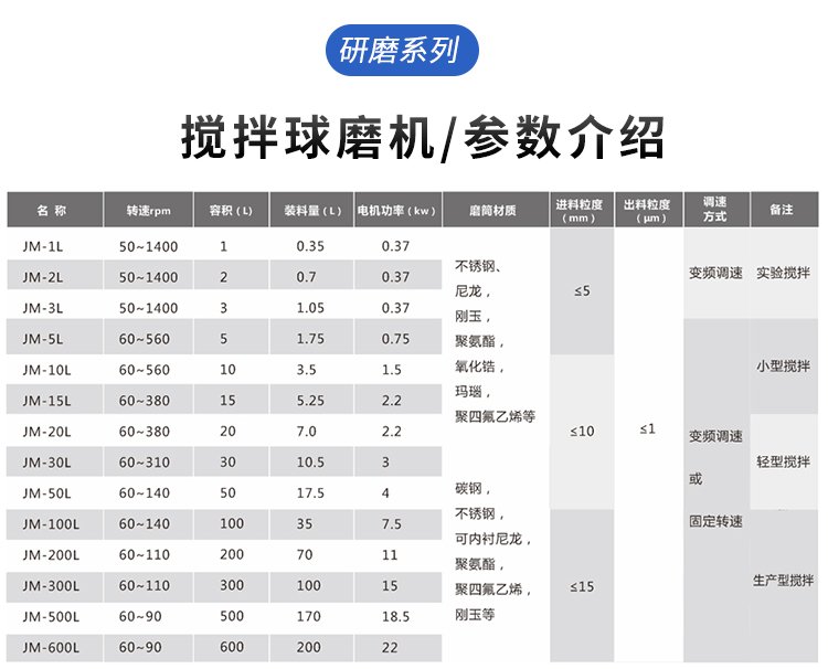 主轴带动搅拌器高速旋转,使研磨介质做不规则的运动,这种杂乱无序运动会产生研磨介质的碰撞、挤压、磨擦和剪切,从而使物料粉碎、细磨。另外,研磨介质间的大小、形状及配比不同,其获得的研磨效果也不同。一般情况下,研磨介质的规格越大,物料粉碎越粗。反之,研磨介质越小,物料研磨越细。而不同规格研磨介质的适当配比,再加上速度的适当调节,其研磨效果更佳。