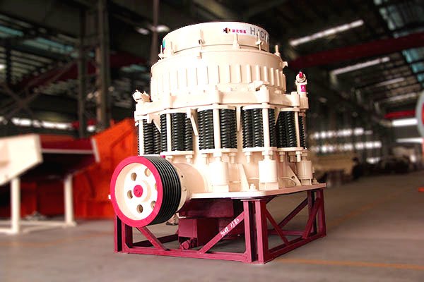 工作时,由电动机通过三角带、大带轮、传动轴、小锥齿轮、大锥齿轮带动偏心套旋转,破碎圆锥轴心线在偏心轴套的迫动下做旋转摆动,使得破碎壁表面时而靠近又时而离开轧臼壁的表面,从而使物料在定锥与动锥组成的环形破碎腔内不断地受到冲击、挤压和弯曲而破碎。经过多次挤压、冲击和弯曲后,物料破碎至要求粒度经下部排出。