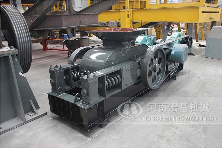 出料粒度的调节:两辊轮之间装有楔形或垫片调节装置,楔形装置的顶端装有调整螺栓,当调整螺栓将楔块向上拉起时,楔块将活动辊轮顶离固定轮,即两辊轮间隙变大,出料粒度变大,当楔块向下时,活动辊轮在压紧弹簧的作用下两轮间隙变小,出料粒度变小。垫片装置是通过增减垫片的数量或厚薄来调节出料粒度大小的,当增加垫片时两辊轮间隙变大,当减少垫片时两辊轮间隙变小,出料粒度变小。驱动机构是由两个电动机,通过三角皮带传动到槽轮上拖动辊轮,按照相对方向运动旋转。在破碎物料时,物料从进料口通过辊轮,经碾压而破碎,破碎后的成品从底架下面排出。