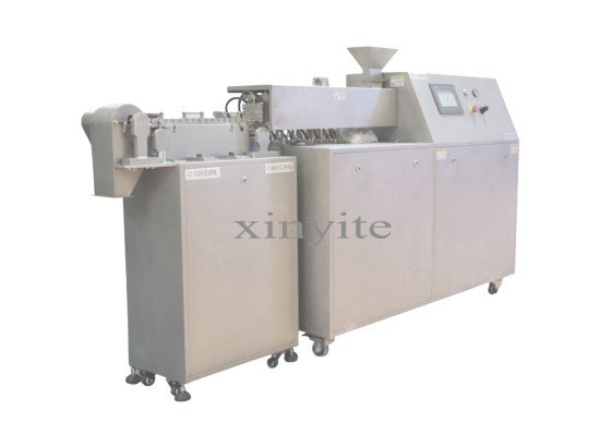 螺杆分段加热,逐级升温,物料逐级熔融,在中间段实现共融,再经逐级降温,最后由螺杆挤压通过孔板形成致密硬实条状物。