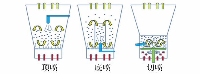 底喷,锅体底部采用双风道进风,物料在导流筒内高速向上运动,进入扩展室后落入导流筒外,