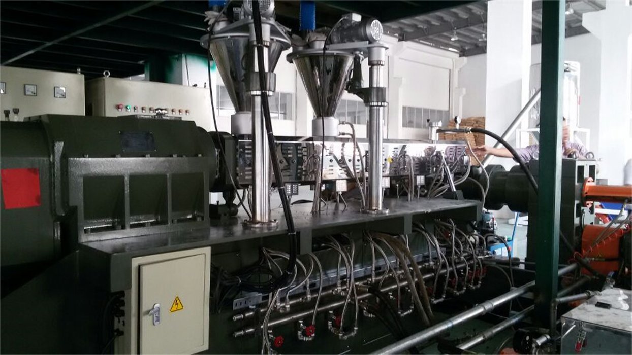高混机----螺旋自动上料机------双螺杆造粒机----------单螺杆造粒机--------挤出模具