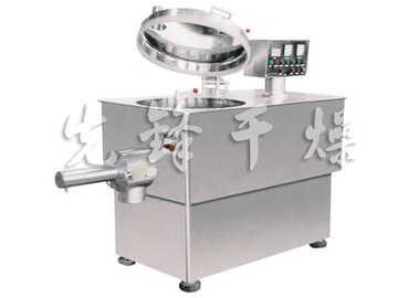 粉体物料与粘合剂在圆筒形容器中由底部混合浆充分混合成湿润软材,然后由侧置的高速粉碎桨切割成均匀的湿颗粒。