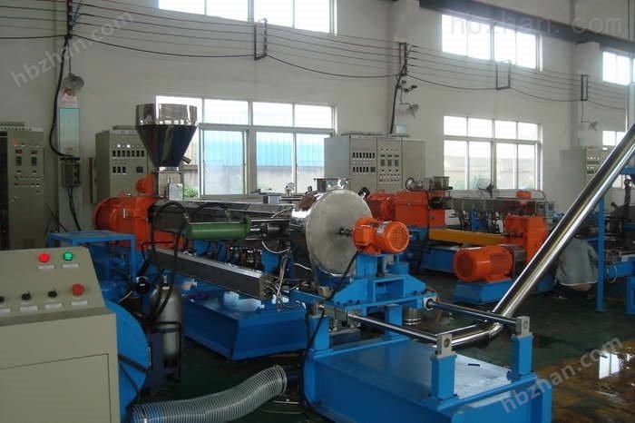 生物降解母粒双螺杆造粒机传动系统:传动系统的作用是驱动螺杆,供给螺杆在挤出过程中所需要的力矩和转速,通常由电动机、减速器和轴承等组成。螺杆转速的控制螺杆转速的调节与稳定是主机传动的重要工艺要求之一。螺杆转速直接决定出胶量和挤出速度,正常生产总希望尽可能实现高转速及实现高产,对挤塑机要求螺杆转速从起动到所需工作转速时,可供使用的调速范围要大。而且对转速的稳定性要求高,因为转速的波动将导致挤出量的波动,影响挤出质量,所以在牵引线速度没有变化情况下,就会造成线缆外径的变化。同理如牵引装置线速波动大也会造成线缆外径的变化,螺杆和牵引线速度可通过操作台上相应仪表反映出来,挤出时应密切观察,确保 高产。