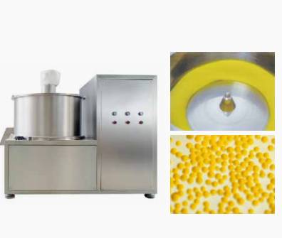本机是通过设置旋转离心盘、鼓风机、气动喷枪,将湿颗粒制成美丽的球丸。将前道工序做成的湿颗粒投入旋转离心盘内,启动鼓风机后再将旋转离心盘启动,使湿颗粒受到环隙空气浮力、旋转离心力、自身重力作用,呈环周绳股状运动,从而形成真球度极高的球丸。