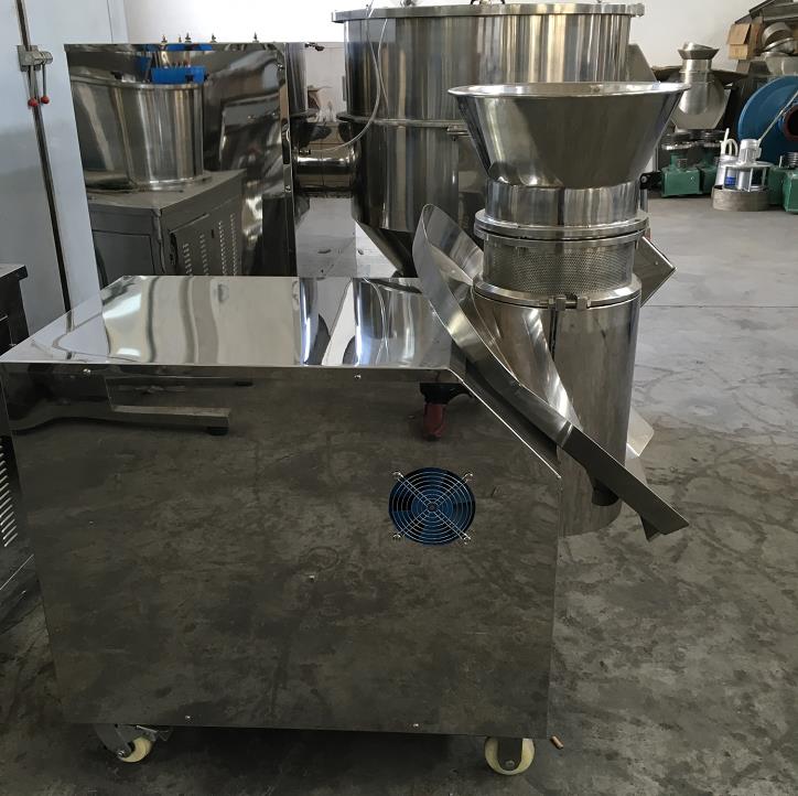 本机是通过一组旋转碾刀,将前道工序制成的湿材注入环碾刀的不锈钢筛筒筛孔中,从而制成圆柱状的湿颗粒,供下道工序抛丸使用。本设备可通过更换不锈钢筛简来取得不同大小的颗粒。