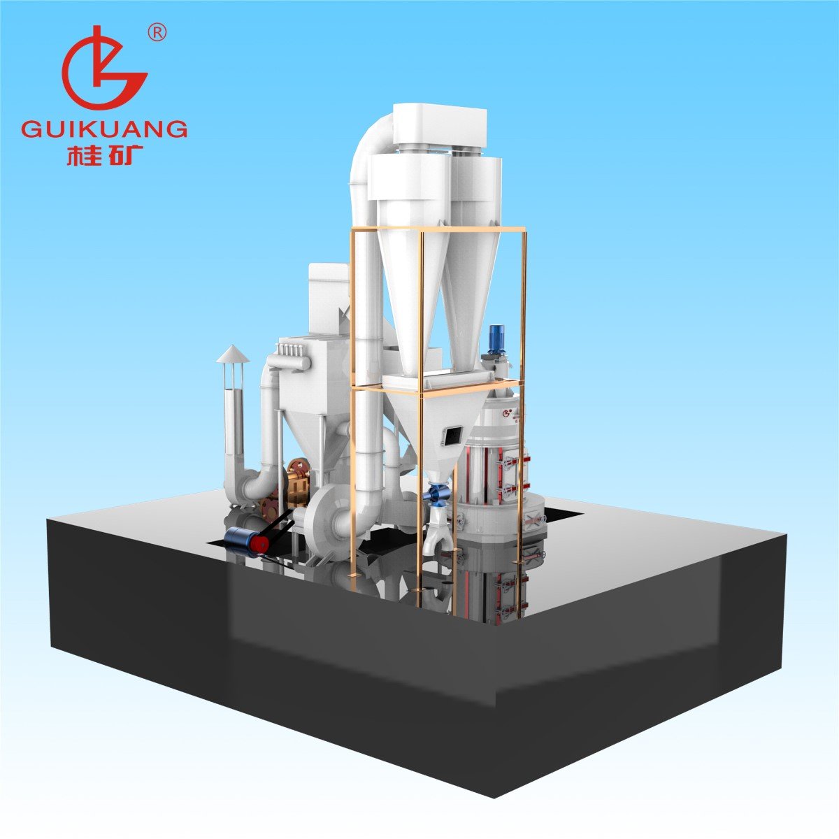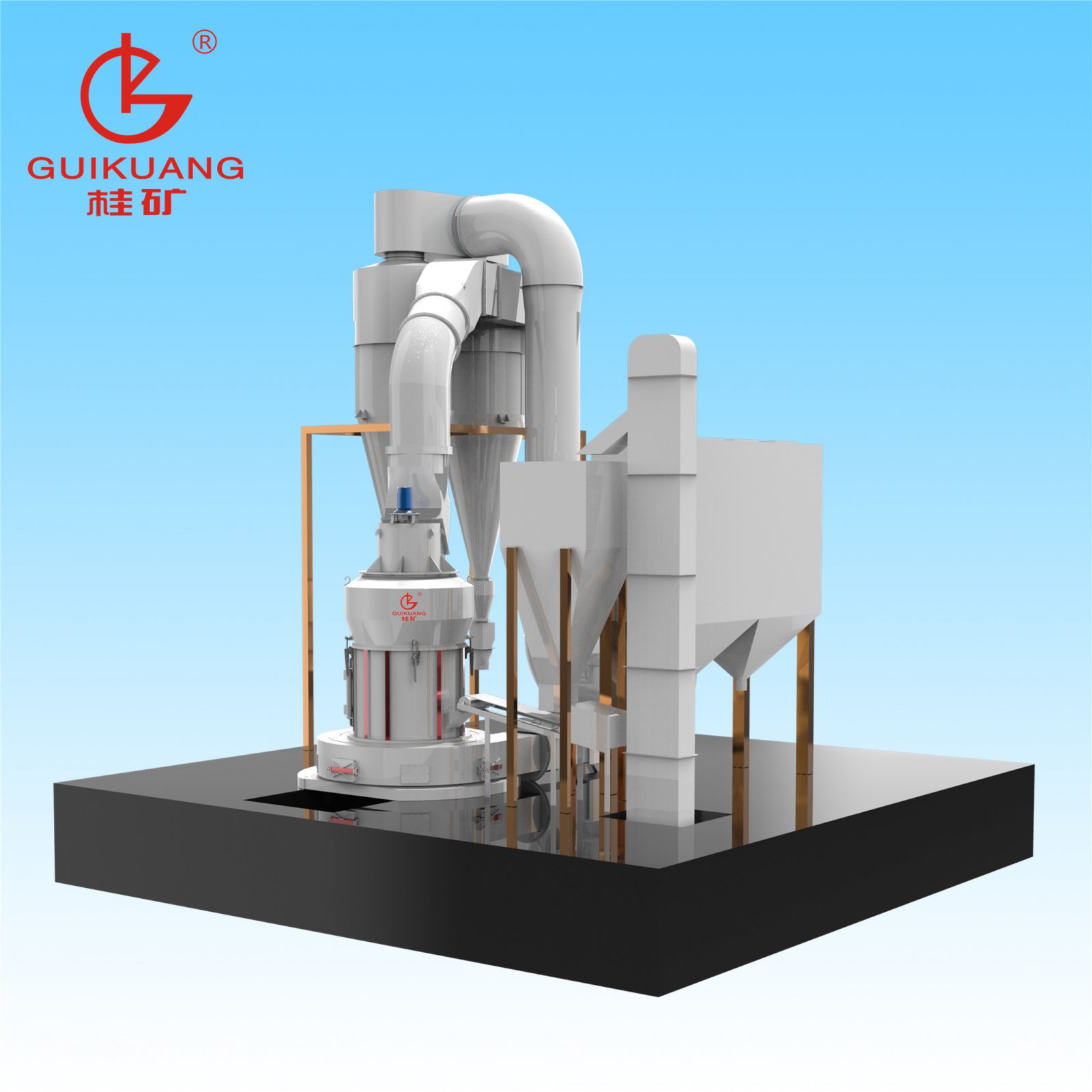 4、桂矿雷蒙磨收集效率高:旋风收集器采用并列双旋风收集器,比单旋风提高了10-15%收集效率。