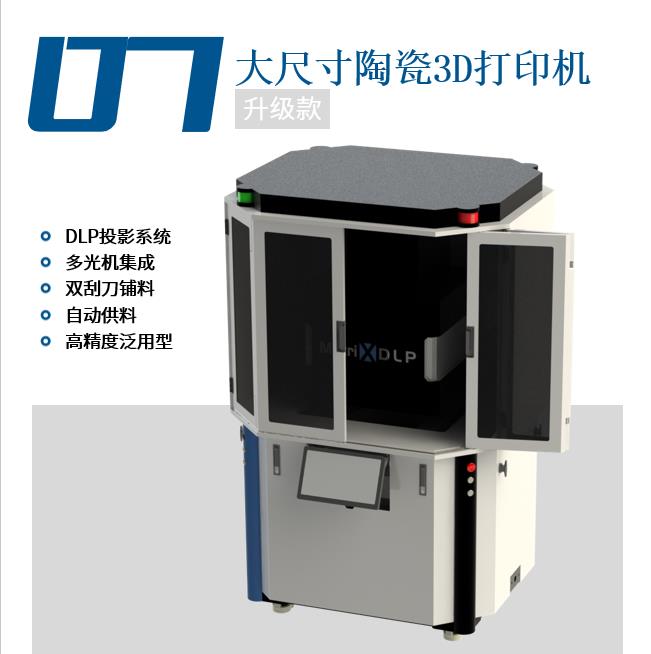 设备由紫外投影模块、刮刀运动模块、料缸与平台升降模块、进料及出料模块、软件 及控制模块、机架等部件组成。该设备提供了一种全新的陶瓷 3D 打印陶瓷成型工艺。通过搭载光垒独有的Matrix-DLP 矩阵光机可满足多种打印幅面需求。采用光机正置、成型平台下沉的打印方式,双刮刀铺料,双料缸供料,设备软件自主研发,参数开源,操作者可根据自身需求调整设置不同打印参数。光垒智造的3D陶瓷打印摆脱了传统工艺的束缚,成型方便,能够制造出传统工艺所不能实现的复杂结构,并且大大缩短了制造周期。