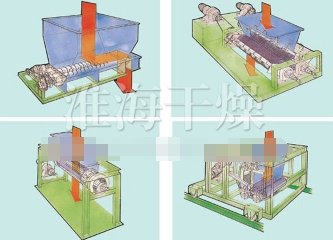 ◎槽形成型机: 由加料斗和刻有槽的二根辊子构成。以增大物料表面积的造粒为目的。物料被内侧运转的辊子吸入,被反转的外侧刮刀切成粒状。