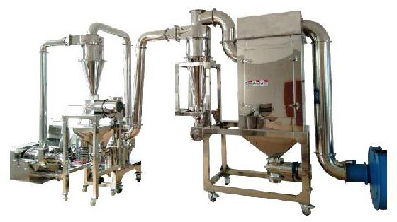 本机由中碎设备主机、旋风分离器、超微粉碎机主机、旋风分离器、除尘器、电控箱等部分组成,超微粉碎机具有风选式、无筛、无网、粒度大小均匀等多种性能,生产过程连续进行。该机在粉碎作业时主机不升温,可粉碎各种热敏性物料。该机广泛运用于制药、食品、化工、(三七、植物纤维及各种物体较大的)低硬度物料的超细粉碎。