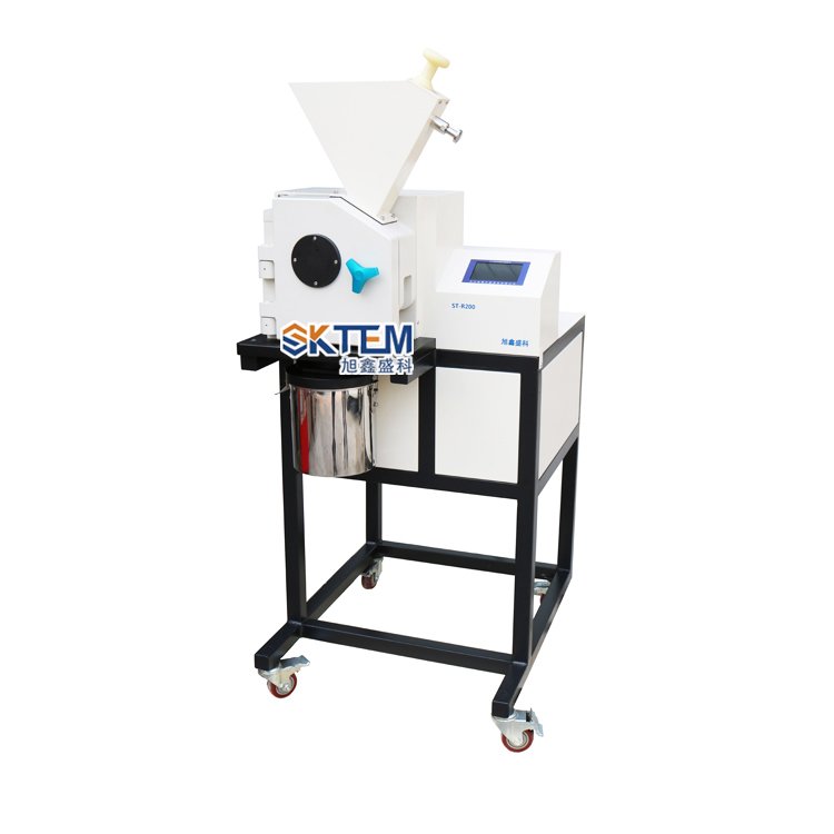 样品通过防反溅的进样料斗进入研磨室内,通过旋转的转刀与固定的切割棱之间的剪切切割作用,对样品进行切割粉碎。样品的出样尺寸取决于底筛孔径,多种规格的底筛满足各种样品的需求。