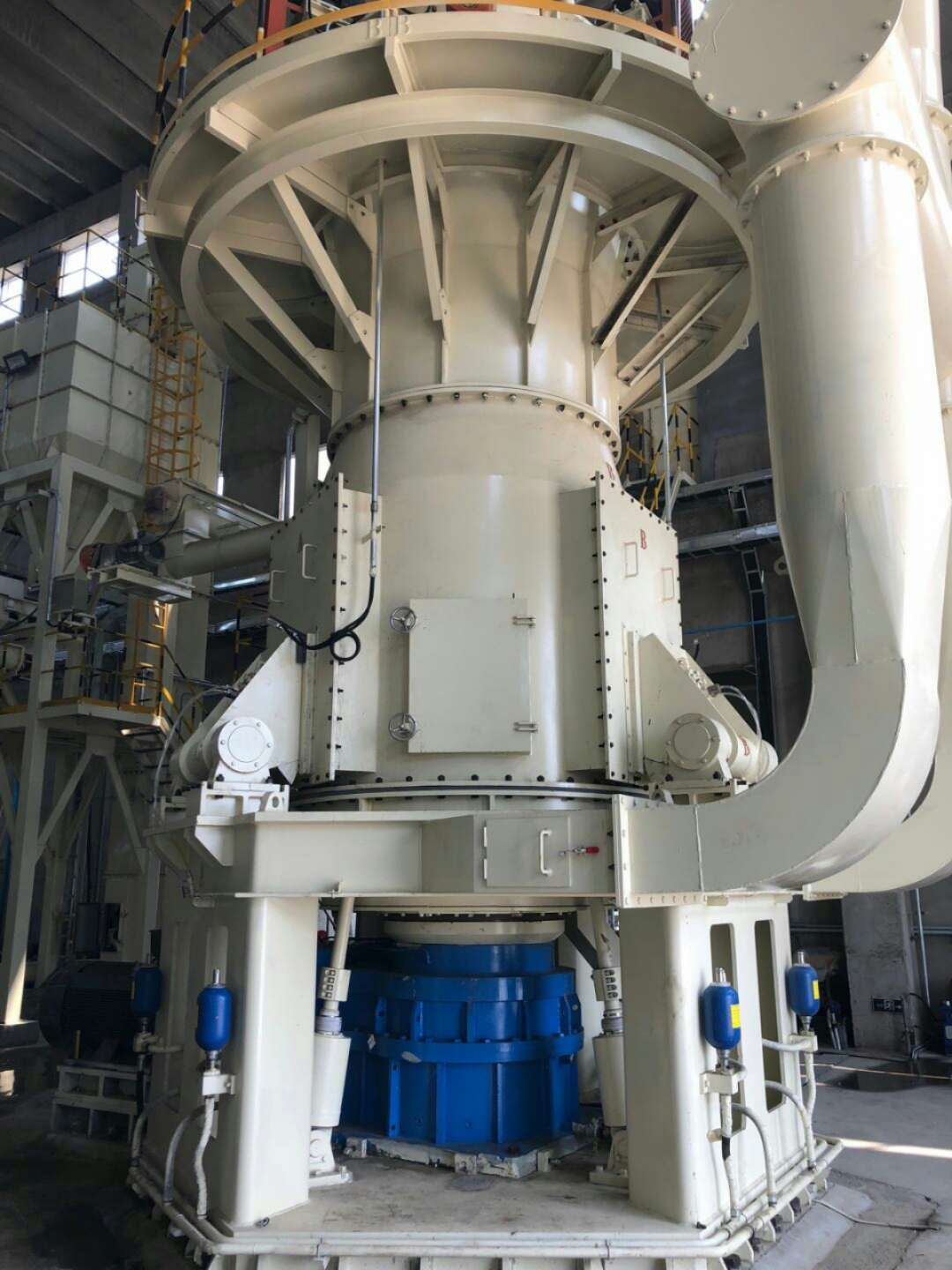 主电机通过减速机带动磨盘转动,物料经螺旋输送机进入立磨主机内,受重力作用落到磨盘中央,同时风机产生的气流从进风口进入主机。在离心力的作用下,物料从磨盘中央向边缘均匀移动,经过磨盘上的辊道时,受磨辊碾压,大块物料直接被压碎,细物料受挤压后形成料层,进行粒间粉碎。粉碎后的物料继续向磨盘边缘移动,直到被磨盘外围的风口环引导的强气流向上带走,较粗的物料由于自身重力原因重新落回至磨盘内,进行再次碾磨;较细物料则随气流上升进入主机上方的分级系统进行筛选分级,在分级转子叶片的作用下,较粗的物料不能被通过,而被叶片重新打落活磨盘内再次碾磨,合格的细粉将随气流带出分级系统,通过外部管路进入除尘系统,然后经除尘器将气流与物料分离、收集后,即为成品。另外,物料中的杂物及大颗粒物料会在研磨时,被刮料板刮入排渣口,排出磨体,从而有效的保证了成品的质量。此外还可通过调节液压系统的压力,来调节磨辊的压力,在一定范围内可适应不同硬度的物料需求;通过调节多转子分级系统的转子转速,来调节分级筛选细度,从而获得多种不同规格的合格成品。