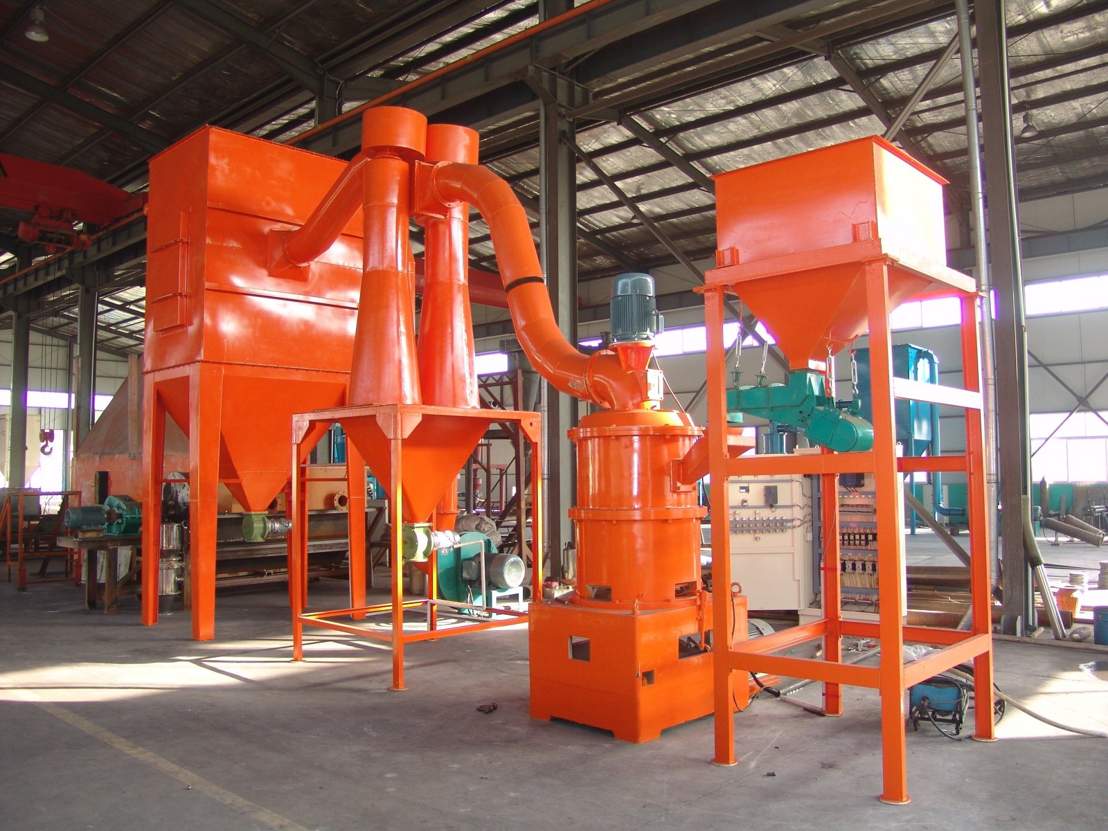 大块物料经锤式破碎机破碎成小颗粒后,由提升机送入储料仓,再经过振动给料机和倾斜的进料管,将物料均匀地送到转盘上部的散料盘上。物料在离心力的作用下散向圆周边,并落入磨环的滚道内被环辊冲击、滚辗、研磨,经过三层环道的加工变成粉体,通过高压风机的抽吸作用将外部空气吸入机内,并将粉碎后的物料带入选粉机内。