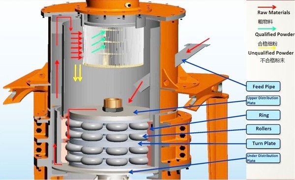 大块物料经锤式破碎机破碎成小颗粒后,由提升机送入储料仓,再经过振动给料机和倾斜的进料管,将物料均匀地送到转盘上部的散料盘上。物料在离心力的作用下散向圆周边,并落入磨环的滚道内被环辊冲击、滚辗、研磨,经过三层环道的加工变成粉体,通过高压风机的抽吸作用将外部空气吸入机内,并将粉碎后的物料带入选粉机内。 GYM系列辊压磨的选粉机内旋转的叶轮使粗物料回落重磨,符合要求的细粉则随气流进入旋风集粉器并由其下部的卸料阀排出即为成品,而带有少量细粉尘的气流则经过脉冲除尘器净化后通过风机和消声器排出。 性能优点: 1、投资省、效率高,与大型成套设备相比,投资节省60%。 2、节能:是当前能耗*低的一种细磨设备,主机电耗<100kW·h/t。 3、易损件使用寿命长,磨辊、磨环采用特殊材料锻制而成,从而使利用程度大大提高。在物料及成品细度相同的情况下,比冲击式破碎机与涡轮粉碎机的磨损件使用寿命长2-5倍,一般可达一年以上,加工碳酸钙、方解石时,使用寿命可达1-5年。 4、破碎比大,能量利用率高。入料粒度<15mm的碳酸钙,一次加工<10μm的微粉,其中-2.5μm的细粉占40%左右,比表面积大。它具有高速冲击式粉碎机生产粉体的高效、低耗的优点,而又有接近气流磨的产品细度。 5、产品粒度可调,细度好,是当前干法生产非金属矿细粉的理想设备。主机内置分级机构,分级轮结构独特,不跑粗粉,可根据需要调节产品细度,它既可生产D97=3-8μm的细粉,亦可生产D97=10-40μm的粗粉。a性。不用专用混凝土基础就能安全使用,降低设备的安装费用。 7、传动效率高,主轴采用减速机传动,其能耗低、效率高,效率≥96%。 8、符合环保排放标准,粉尘排放低于40mg/m3。 应用范围: 1、本机适用于莫氏硬度≤6的脆性物料的粉碎,如重钙、硅灰石、高岭土、赤铁矿、滑石、重晶石、长石、炉渣 等物料的粉碎加工,要求给料粒度不大于15mm,水份小于10%。 2、本机亦可用于不带胶质短纤维物料的超细粉碎,如木粉加工,要求入料粒度不大于2mm,水份小于5%,粉碎后产品细度D97=43-860μm。 特别提示:德尔粉体设备公司的辊压磨针对人造石墨、核桃壳等轻质物料进行了结构优化,可大大提高粉碎效率。