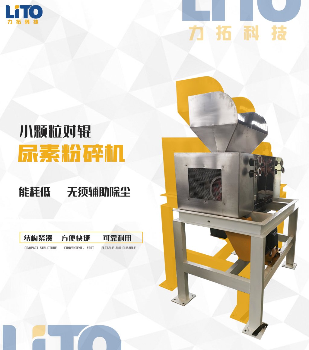 3.两辊尿素粉碎机的粉碎速度快、粗细可以调节、均匀,不粘辊、操作简单、可靠、无易损件、无粉尘。