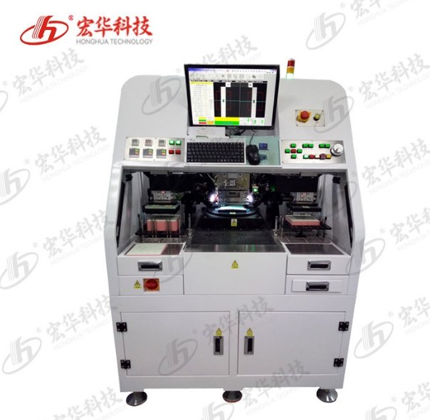 适用于电子元件切割工序,采用两组CCD摄像系统对陶瓷膜(或其他生胚膜)上Mark线进行视觉取像,依据图像数据处理计算角度和位置精确定位,使用合金刀片对陶瓷膜(或其他生胚膜)进行高速高精度切割成电子元件颗粒。