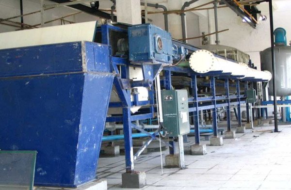 橡胶带式真空过滤机是一种连续的真空过滤机,其滤布由带沟槽的橡胶带支撑,胶带下面是真空盒,滤液在重 力与真空作用下沿沟槽流向胶带中间,然后通过一系列排液孔进入真空盒,实现固液分离。起关键密封作用的是真 空盒与胶带之间的摩擦带,为了减少运行摩擦阻力及防止真空泄漏,辅以水质洁净、温度适中的滑台密封水。