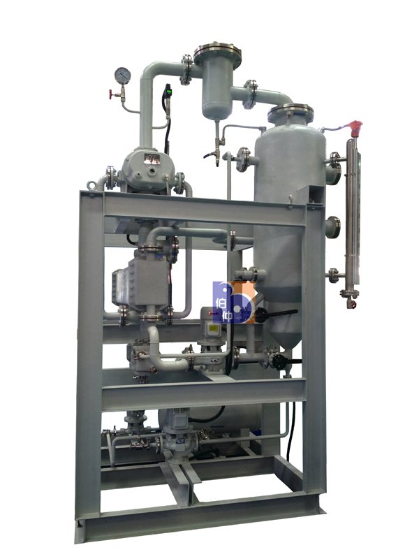 溶液在一个蒸发罐里,可通过物料循环泵在加热管内循环。初始蒸汽用新鲜蒸汽在管外给热,将溶液加热沸腾产生二次蒸汽,产生的二次蒸汽由蒸汽压缩机吸入,经增压后,二次蒸汽温度提高,作为加热热源进入换热器循环蒸发。正常启动后,蒸汽压缩机将二次蒸汽吸入,经增压后变为加热蒸汽,就这样源源不断地进行循环蒸发。蒸发出的水分*终变成冷凝水排出。